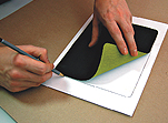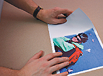 4 The next step is gluing the foam together with the photo. The photo is placed on a flat surface facing downward with the printed side, then we tear off a narrow piece of protective paper and glue it to the photo starting from the spot marked as the edge of the pad. Then we slowly tear off the remaining pieces of protective paper on the foam and carefully glue the two parts together ensuring that no air bubbles are trapped between the foam and the foil.